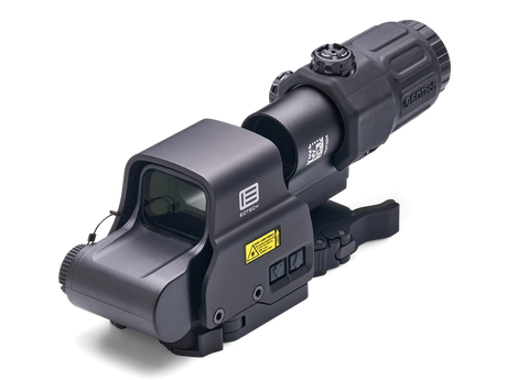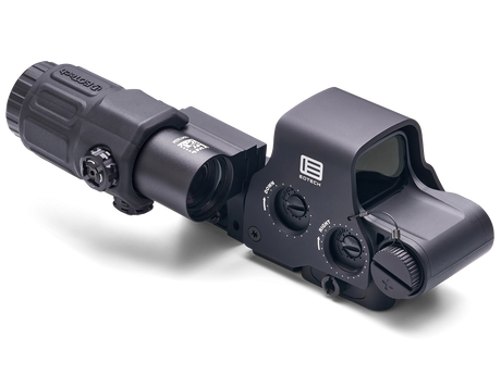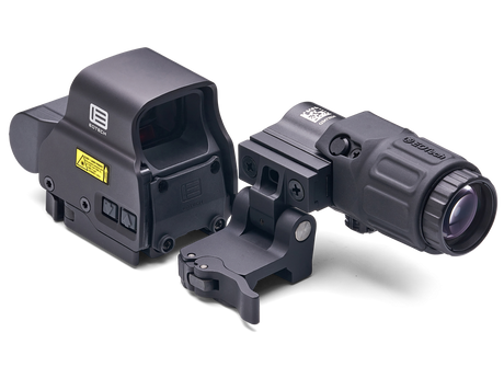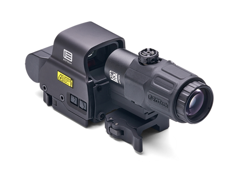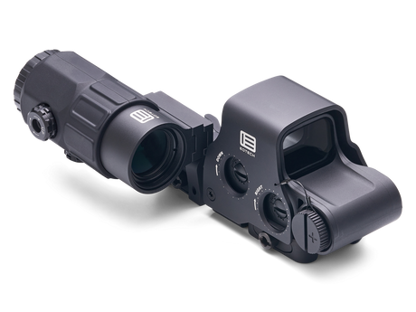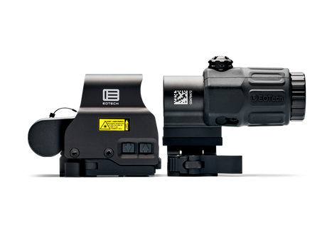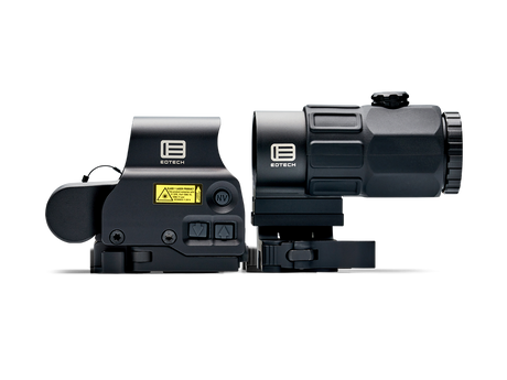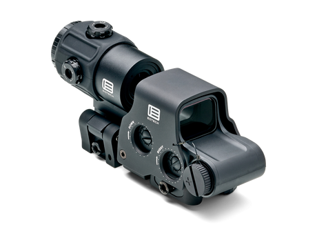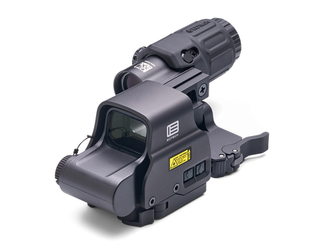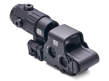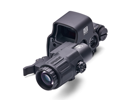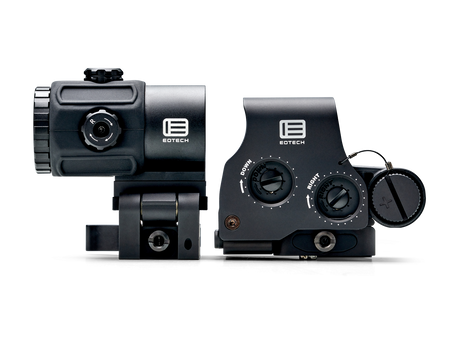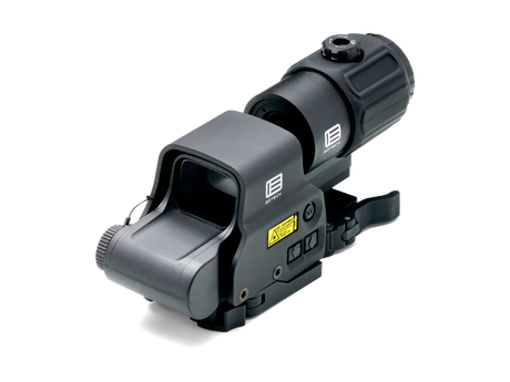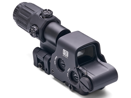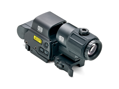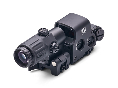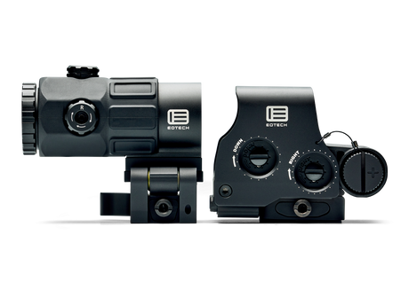 The EOTECH® magnifiers are designed to be used behind an EOTECH Holographic Weapon Sight (HWS®). The magnifiers can be mounted directly behind the HWS. Simply switch the magnifiers out of the way for quick 1X targeting. When used with HWS Models 518, 558 and EXPS (with side button interface), the user can easily operate the sight even with the magnifier engaged.
