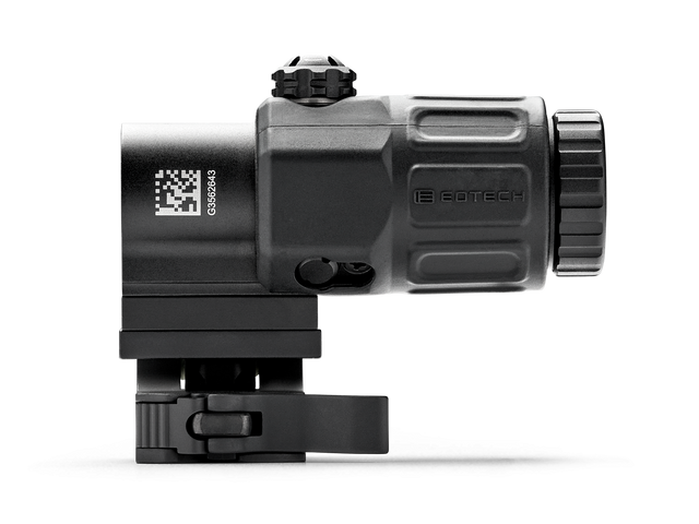 The G33 Magnifier is the selected magnifier of USSOCOM, and is compact and lightweight. The mount provides fast transitioning from 3X to 1X, and the optic offers tool-free vertical and horizontal adjustments, larger field-of-view and an adjustable diopter for improved, precise focusing. The G33 works with all EOTECH HWS models.